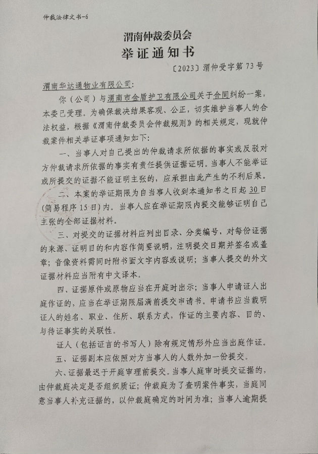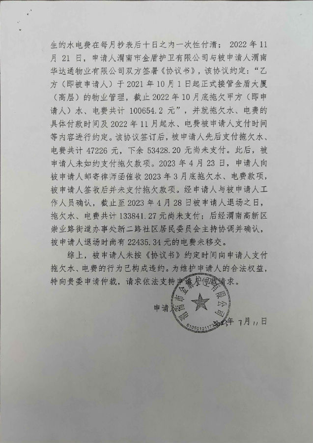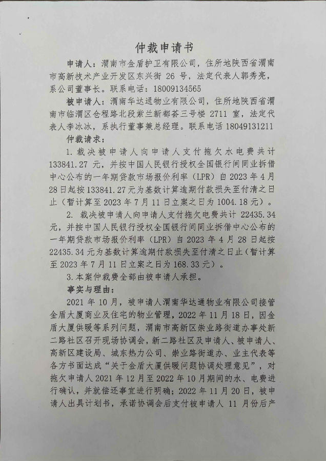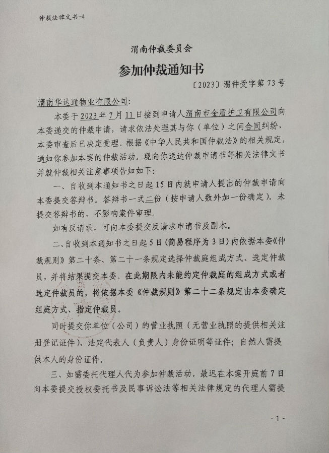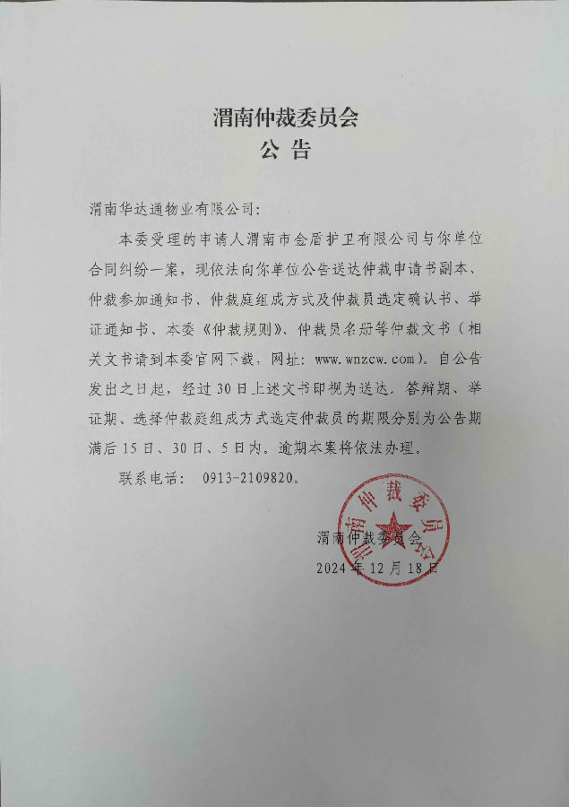 渭南市金盾護(hù)衛(wèi)有限公司與渭南華達(dá)通物業(yè)有限公司合同糾紛案公告