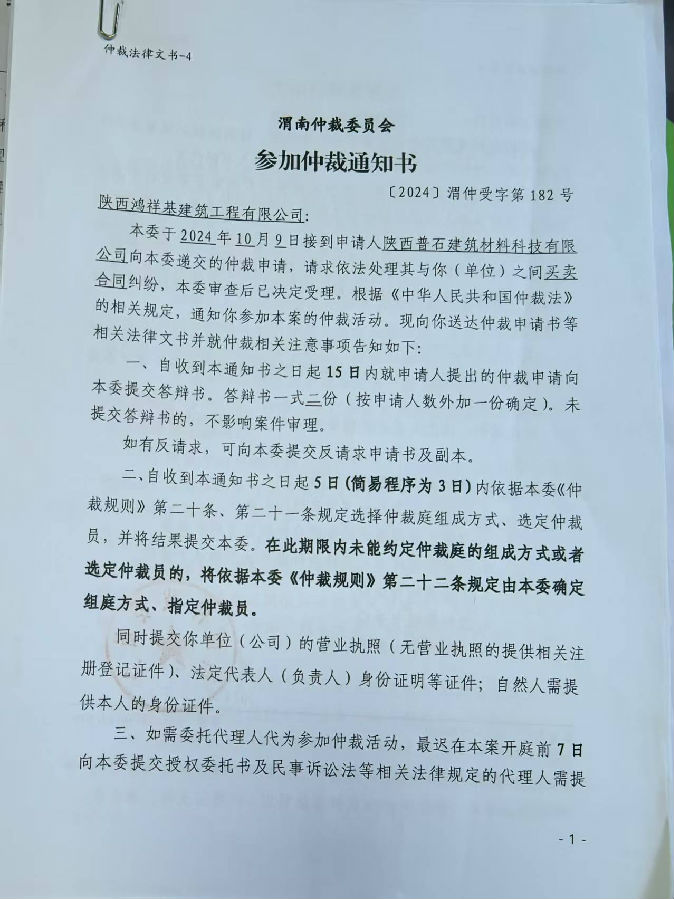 陜西普石建筑材料科技有限公司與陜西鴻祥基建筑工程有限公司買賣合同糾紛案公告